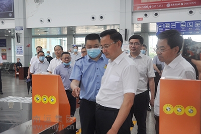 市委常委、市政府副市長(zhǎng)伍定(右三)和市委常委、市總工會(huì)主席李在偉(左三)考察南充汽車客運(yùn)站人臉識(shí)別進(jìn)站乘車系統(tǒng)
