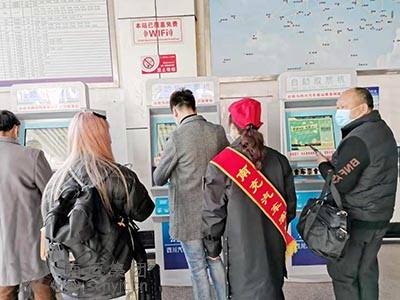 站務(wù)人員引導(dǎo)旅客在售取票機(jī)上購(gòu)取車票