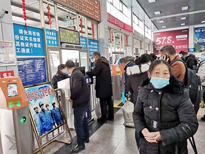 與以往熙熙攘攘、摩肩接踵的景象不同,空曠的售票大廳里,返崗的旅客掃碼、測(cè)溫、保持間距,喧囂不再,但一切井然有序。3個(gè)售票窗口有三三兩兩的旅客在購(gòu)票。車站網(wǎng)上購(gòu)票的旅客已增加到60%。在1名“小紅帽”站務(wù)人員的引導(dǎo)下,旅客們?cè)?0臺(tái)自助(售)取票機(jī)前便捷的。ㄙ(gòu))票。另1個(gè)廣東、深圳、汕頭、福建、溫州的售票窗口基本上無人問津。為了方便農(nóng)民工回家返崗,車站專門設(shè)置了農(nóng)民工服務(wù)臺(tái)、農(nóng)民工優(yōu)先售票窗口和農(nóng)民工檢票進(jìn)站綠色通道,車站工作人員熱情為農(nóng)民工提供指路、購(gòu)票、咨詢、搬運(yùn)行李、維護(hù)秩序等服務(wù),深受農(nóng)民工歡迎。