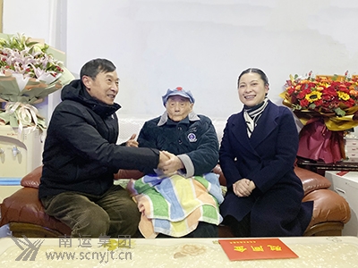 市交通運(yùn)輸局黨委書記、局長(zhǎng)劉曉梅(右一)在南運(yùn)集團(tuán)黨委書記、董事長(zhǎng)、總經(jīng)理王希平(左一)的陪同下,上門看望慰問南運(yùn)集團(tuán)老紅軍曹守成。