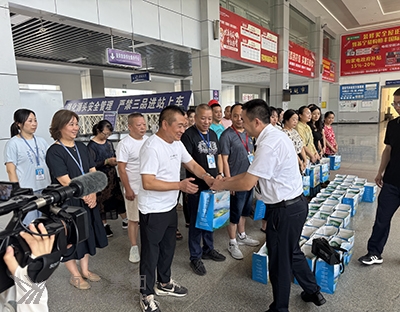 蓬安縣縣委常委、統(tǒng)戰(zhàn)部長龔紅平(右二)到蓬安車站送清涼