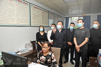 市委書記劉強(qiáng)(左四)在南運(yùn)集團(tuán)高速客運(yùn)分公司查看客運(yùn)車輛實(shí)時監(jiān)控視頻。