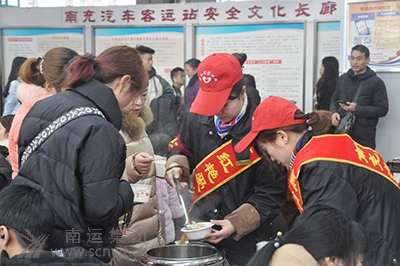 頭戴“小紅帽”、身佩大紅綬帶的匡紅艷愛心班的站務(wù)人員,不停地穿行在售票廳、候車廳。有引導(dǎo)旅客購(gòu)票上車的導(dǎo)乘人員,有在愛心驛站為旅客不厭其煩耐心解答的咨詢?nèi)藛T,有在車站候車廳為旅客送鮮開水的服務(wù)人員,有滿腔熱情地扶老攜幼的青年志愿者。一位帥哥焦急地問“小紅帽”站務(wù)人員:“手機(jī)沒電了,哪里可以充電?”“小紅帽”站務(wù)人員一邊手指著右邊的“手機(jī)臨時(shí)充電處”,一邊熱情地說:“那里可以免費(fèi)充電!”帥哥說:“謝謝!”上午9點(diǎn)多鐘,“小紅帽”站務(wù)人員又為一早從鄉(xiāng)村來南充乘車的農(nóng)民工兄弟姐妹們送來了一碗又一碗的熱氣騰騰的“愛心餃子”,候車廳沸騰了起來,有的農(nóng)民工說:“太謝謝了!”有的旅客說“太周到了!”有的年輕小伙子和靚妹興致勃勃地拿起手機(jī)拍下了這一溫馨的時(shí)刻,為南充汽車客運(yùn)站點(diǎn)贊!