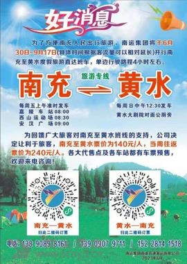 位于重慶石柱土家族自治縣境內(nèi)的黃水森林公園,屬國家級森林公園,年平均氣候在18度左右,是重慶市五個國家級森林公園中最年輕、面積最大、唯一的少數(shù)民族旅游風景區(qū)。也是廣大旅游愛好者和夏季清涼避暑休閑的首選旅游景區(qū)。 為滿足廣大旅游愛好者和夏季清涼避暑休閑的出行需求,南充汽車客運站從2023年6月30日起開行南充至黃水的旅游直通車,發(fā)車時間為每周五上午08:00時。我們還可以為您提供團體出行預約服務,只為您能度過一個愉快而舒適的夏季!如果您想提前了解相關(guān)情況,歡迎廣大旅客通過電話咨詢:南充汽車客運站服務熱線:0817-3638622 15228141518 溫馨提示: 1.網(wǎng)絡購票請下載“團子出行”或“四川汽車客運票務網(wǎng)”。 2.乘車時請攜帶本人有效身份證件乘車。 (南充客運站 彭慶紅) (高客分公司 朱 玲)